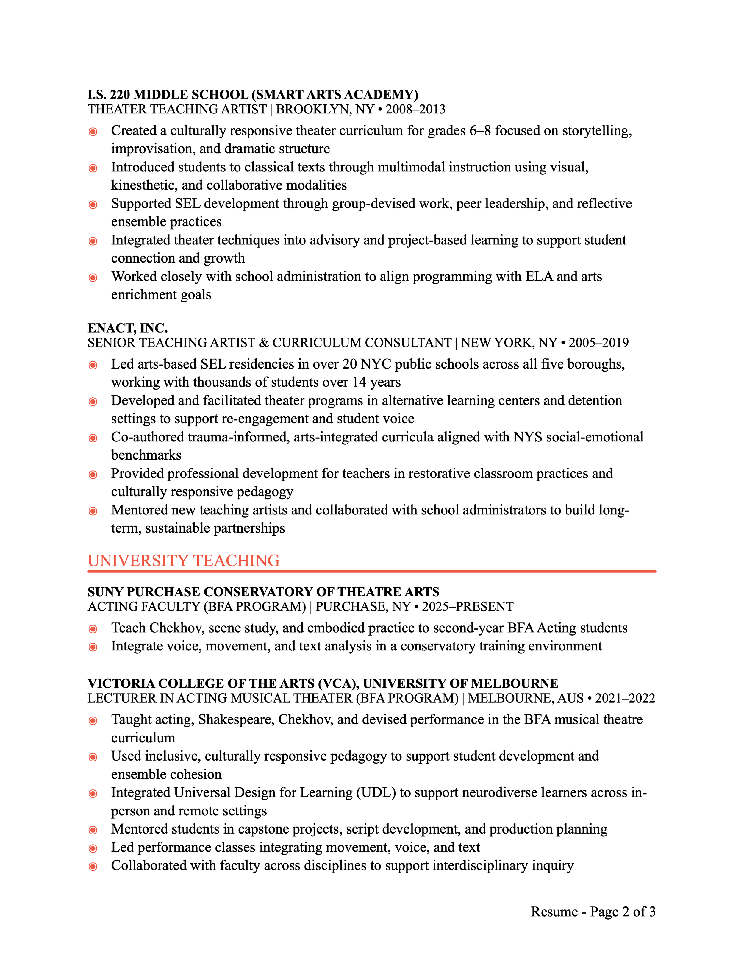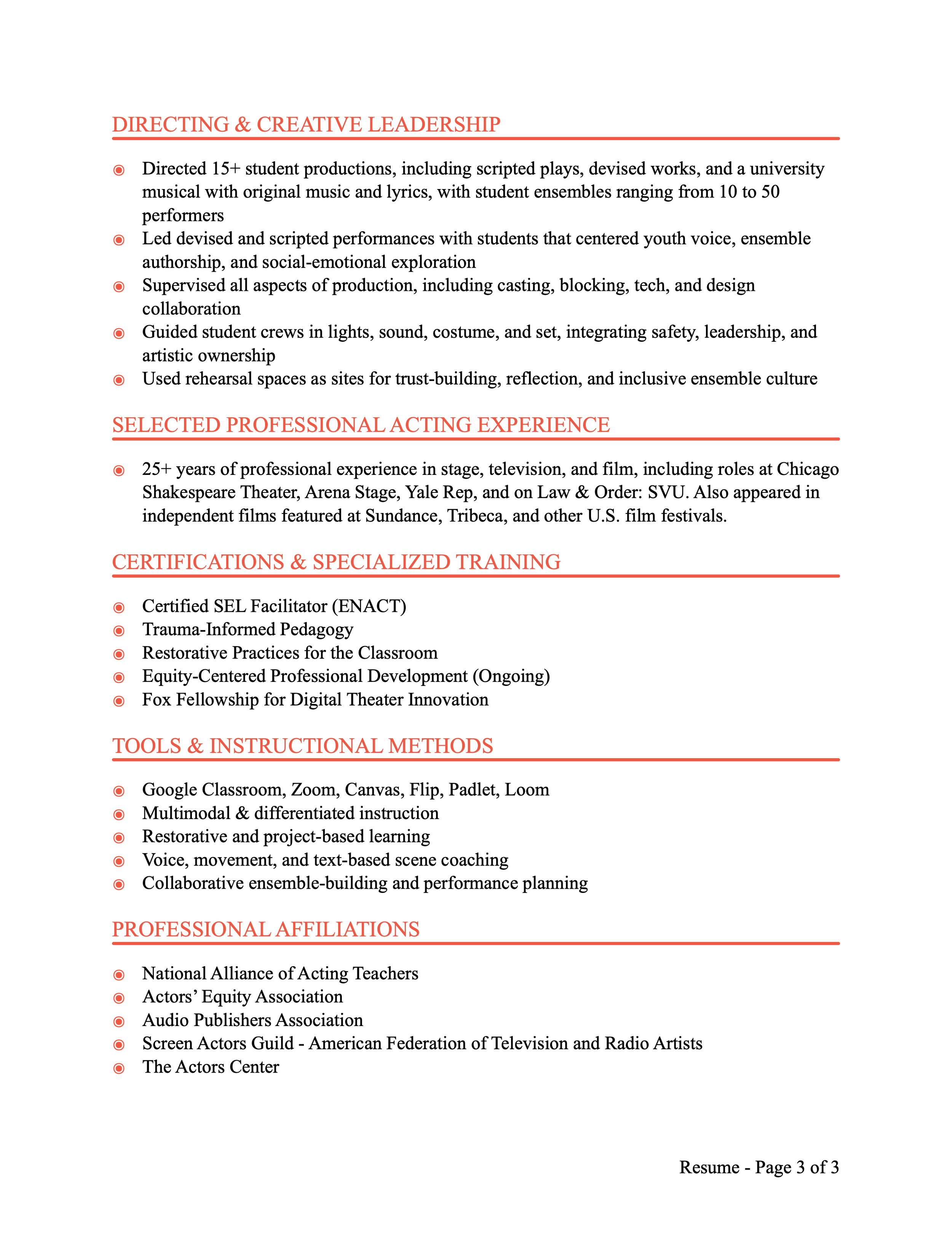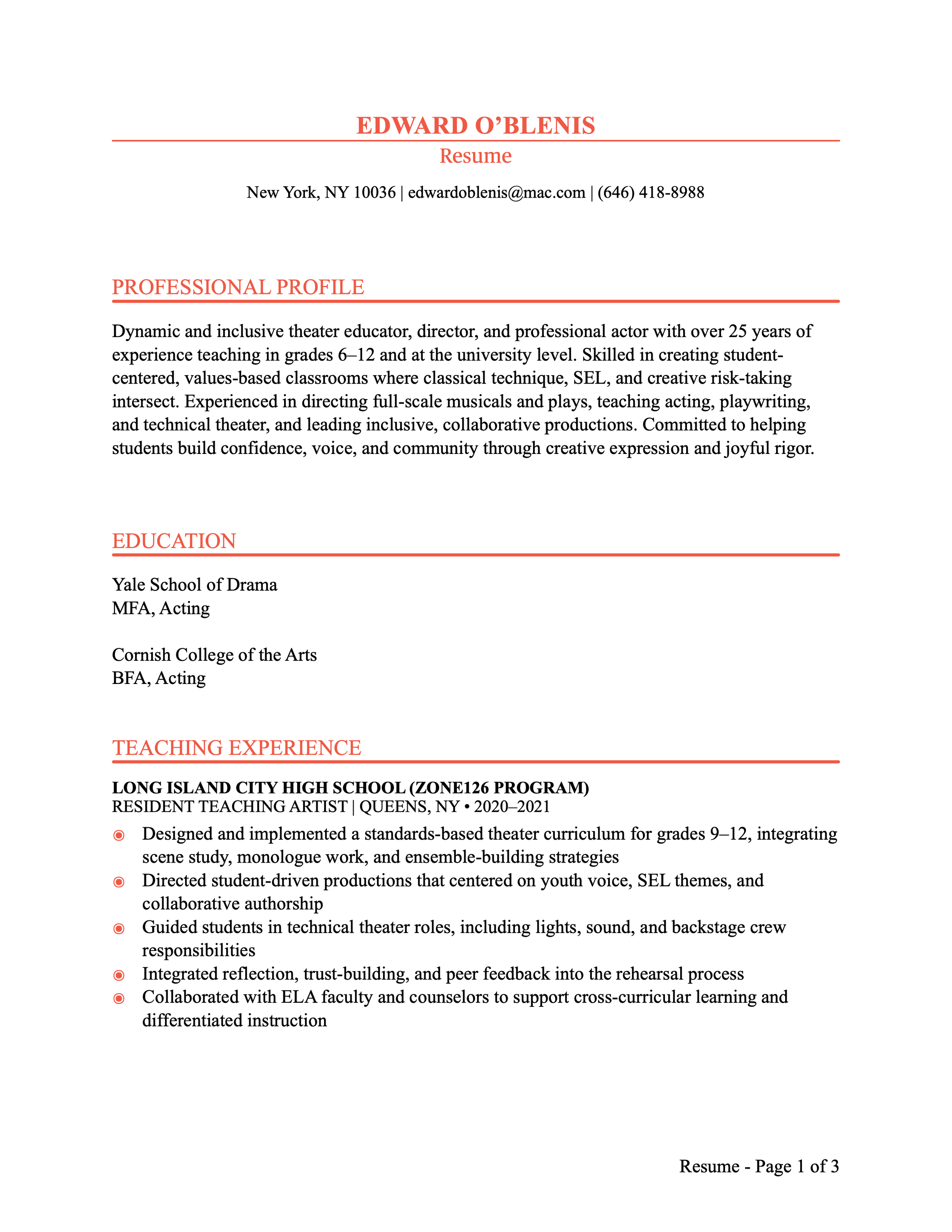 Edward is a member of the National Alliance of Acting Teachers (NAAT) and holds certificates from the Society of American Fight Directors (certified and recommended), the New York State Department of Education, the CITI Program (Basic/Refresher Social & Behavioral Research), and Information Privacy Security (IPS).